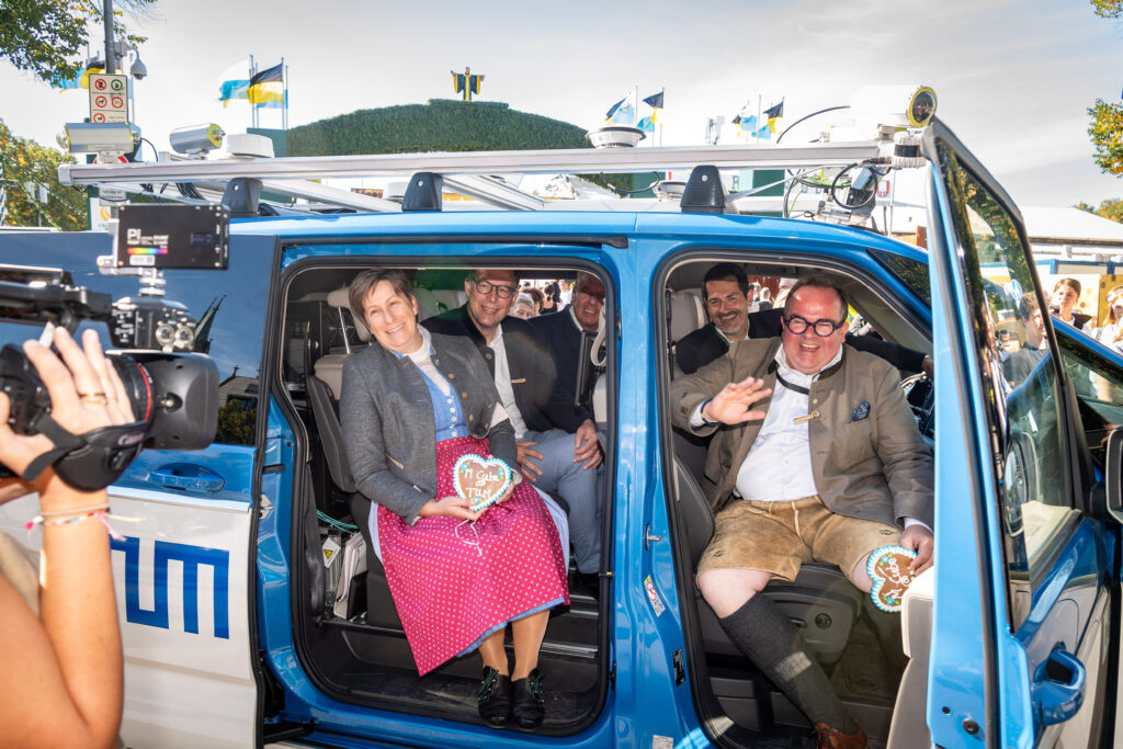 Die Demo-Fahrt unseres autonomen Shuttles fand in prominenter Begleitung, am 25. September 2024, statt: Münchens Oberbürgermeister Dieter Reiter, der Bayerische Staatsminister Markus Blume, TUM-Präsident Thomas F. Hofmann, Sabine Effner vom Mobilitätsreferat der Stadt München sowie Wiesn-Chef Clemens Baumgärtner waren an Bord. Sie alle konnten sich hautnah von der Leistungsfähigkeit und dem Potenzial unserer Technologie überzeugen.