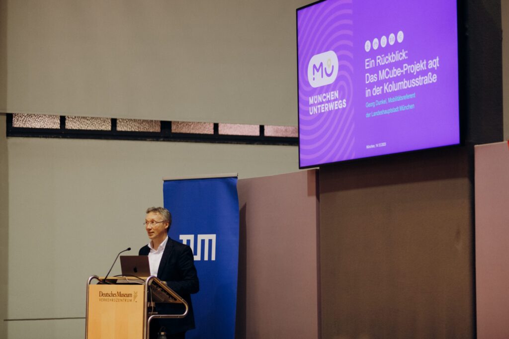 Georg Dunkel, Leiter des Mobilitätsreferats der Landeshauptstadt München sprach sich klar für die Wichtigkeit aus, Projekte zu testen und sah das Projekt an der Kolumbusstraße grundsätzlich als Erfolg. Er kritisierte dabei aber vor allem die unzureichenden rechtlichen Rahmenbedingungen: „Das Blockieren von Reformen durch den Bundesrat und der Mangel an Handlungsspielraum für Kommunen bei der dringend notwendigen Verkehrswende sind ein Schlag ins Gesicht.“ Er unterstreicht die Dringlichkeit von mutigen und innovativen Ansätzen in der lokalen Verkehrspolitik und fasst zusammen: „Veränderungen schmerzen, aber Stillstand ist keine Option.“